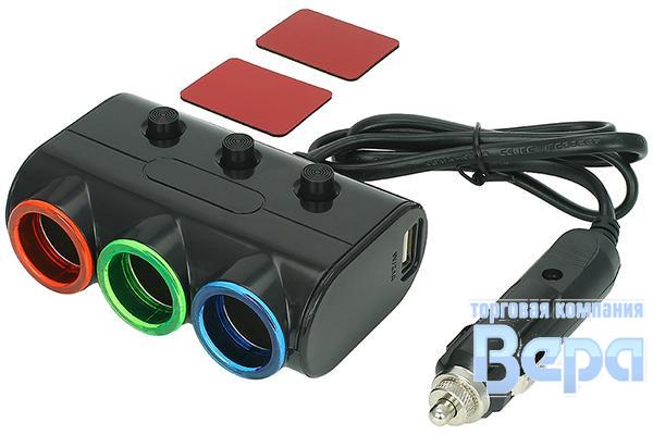 Разветвитель прикуривателя 3 гнезда (2USB) с удлинителем, с выключателем 12/24V 2100mA