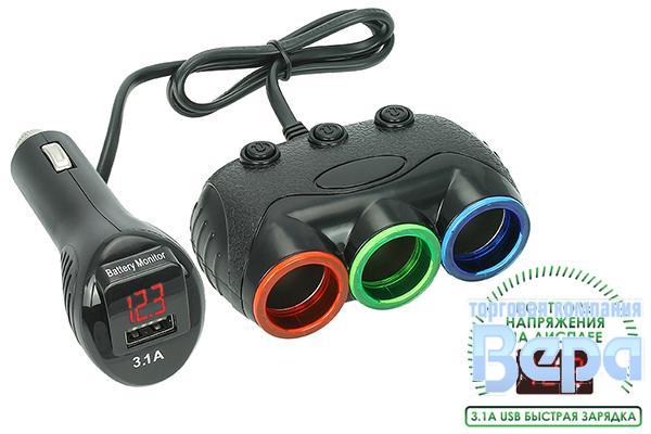 Разветвитель прикуривателя 3 гнезда ( USB)+ВОЛЬТМЕТР с удлинителем 12/24V 3100mA